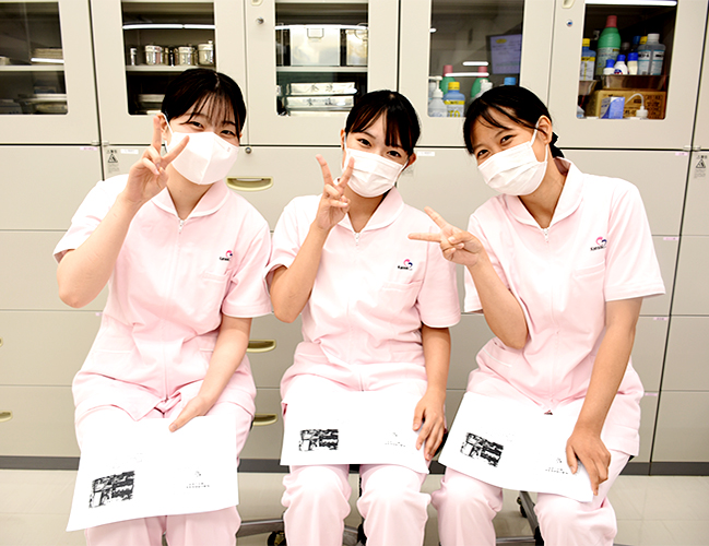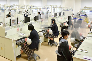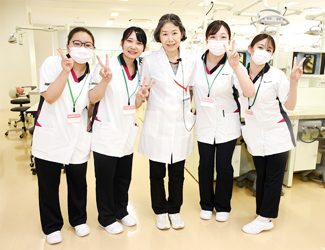 歯科衛生士は様々な歯科用機械を取り扱い、歯科医師の診療の介助を行っています。感染予防のために医療従事者が使用している防護エプロン、グローブ(医療用手袋)を着用し、歯科用機械の操作を体験してみましょう。
