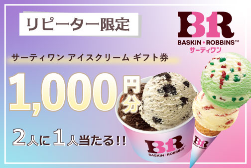 サーティワン アイスクリームで使えるギフト券💳1,000円分が2人に1人に当たります🎯