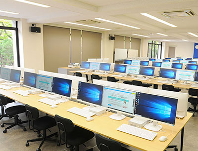 最新の情報機器がそろうPC実習室です。大学2号館1階 第2PC実習室は自習にも利用可能で、幅広く学生たちに利用されています。