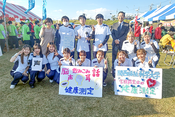 会場には、市民郷土まつり、商工まつり、スポーツフェスティバル、環境フェアなどのほか、河内音頭おどり全国大会など、多くの団体が会場を盛り上げ、関西福祉科学大学 リハビリテーション学科もブースに出店し、市民の方とふれあいました。